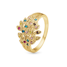 Denne elegante påfuglering er en af vores absolutte favoritter. Ringen er af 18 karats forgyldt sterlingsølv og består af fine glimtene fjer, som fordeler sig bredt ud over skinnen med 21 farvede CZ som fuldender det smukke design.