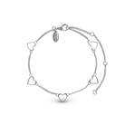 Et armbånd, der leger med kontrasten mellem tilstedeværelse og frihed. De fem åbne hjerter svæver let på fine kæder og symboliserer en kærlighed, der er der – men ikke helt bundet. Et smykke, der emmer af boheme, luksus og personlig stil.