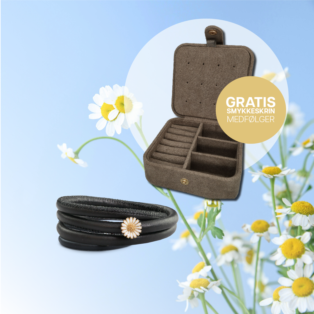 Gavetid med CHRISTINA® Classic læderarmbånd med Marguerite charm og smykkeskrin.
