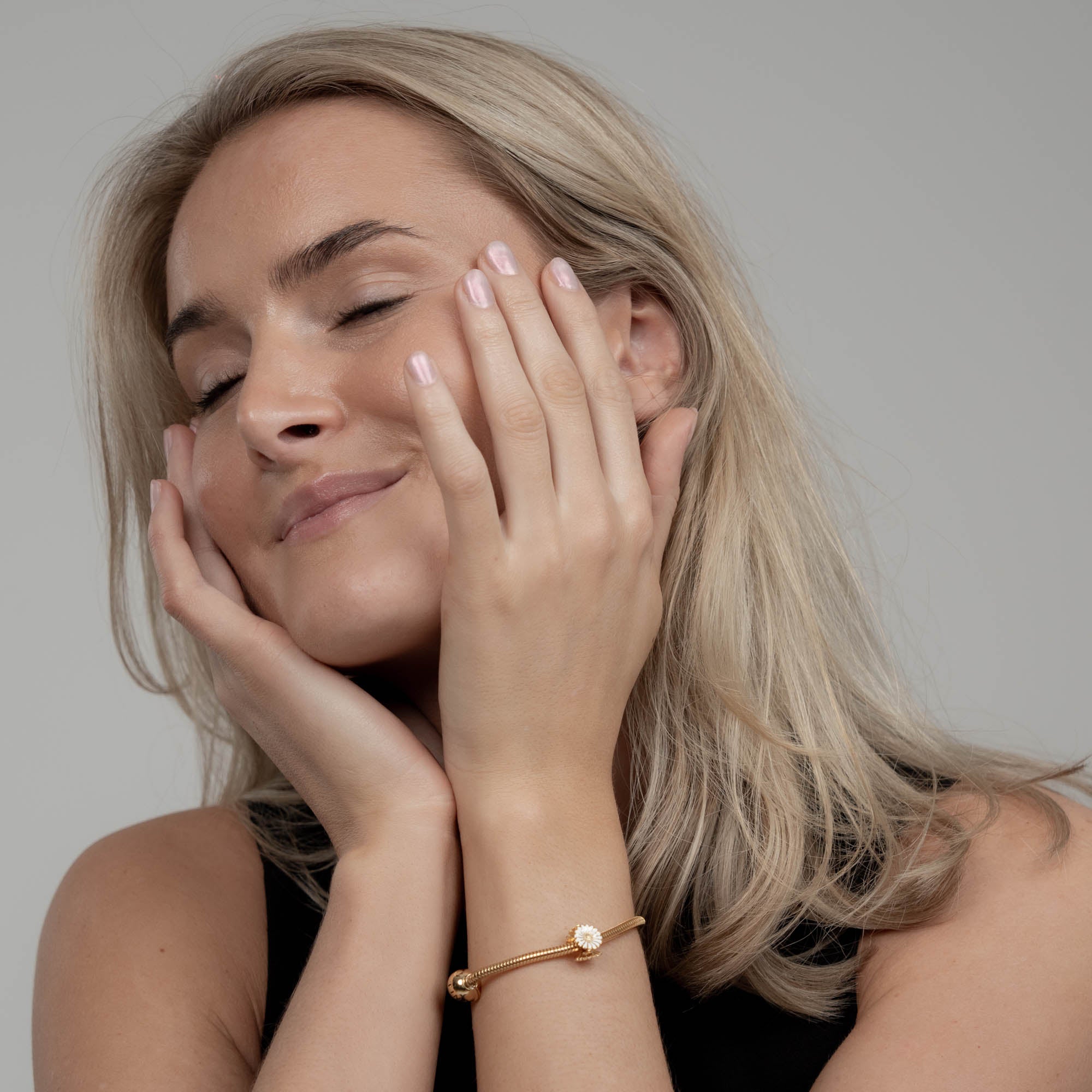 Rengør skånsomt med en tør pudseklud for at bevare guldbelægningen, da denne vil blive slidt over tid. Overvej genforgyldning, hvis smykket mister sin glans
