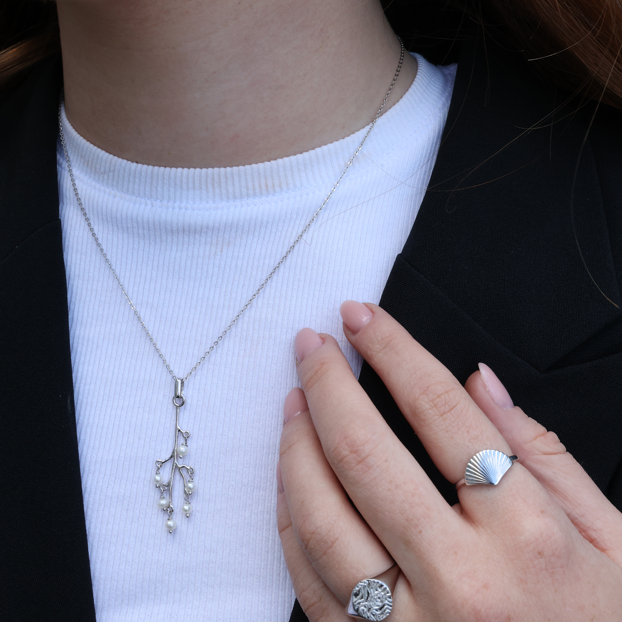 Lad naturens charme folde sig ud med Cherry Tree, et vedhæng der balancerer bohemestemning med luksuriøs finesse. Fremstillet i allergivenligt 925 sterling sølv og prydet med seks delikate ferskvandsperler, der hænger som små, skinnende kirsebær.