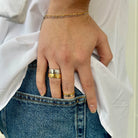 Sterlingsølv ring med banket overflade. Ringen har forskellige former og kanter, hvilket gør den rå, men samtidig feminim. Vores forgyldte sølv giver ringen en ekstra skarp kant.