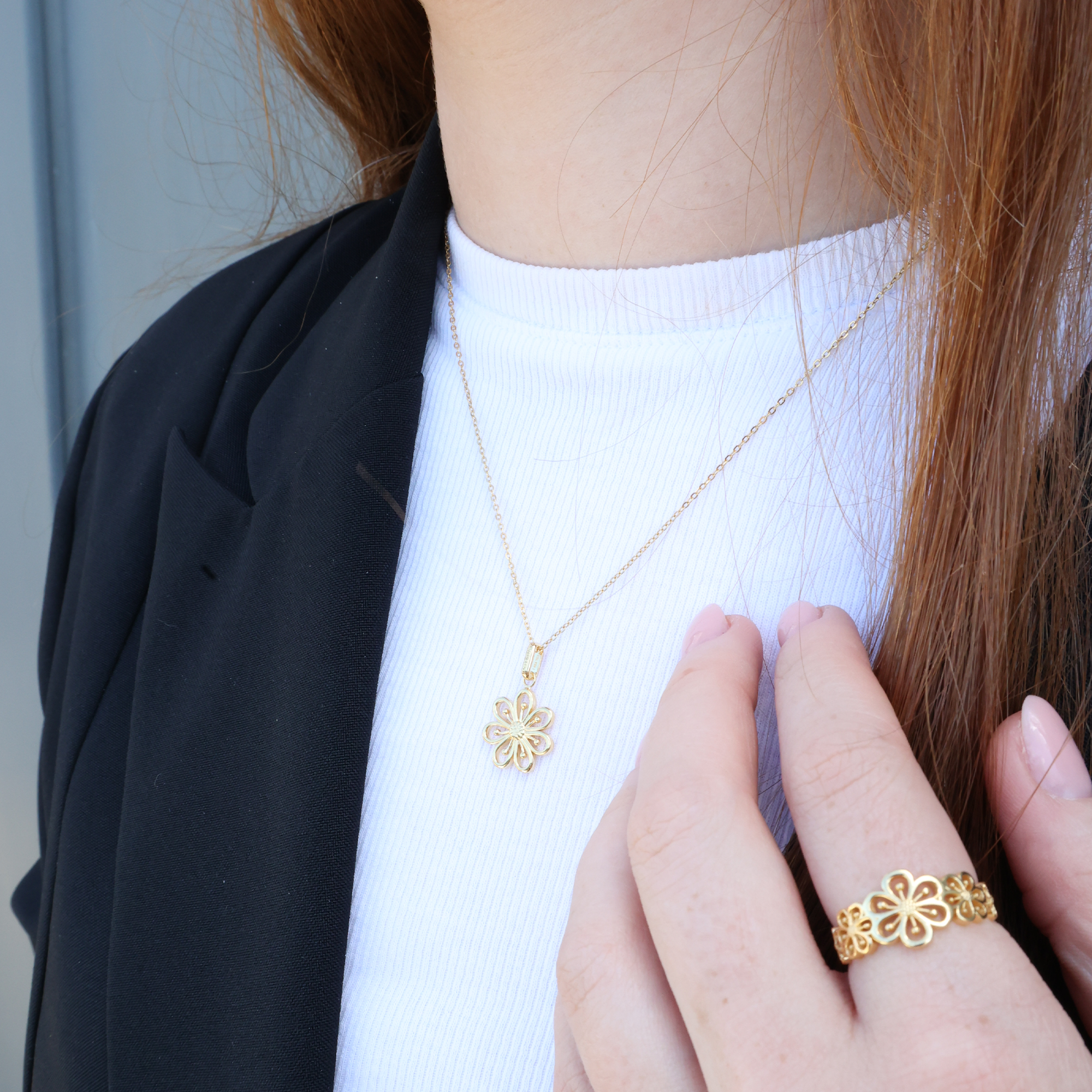 Den skinnende overflade og de bløde blomsterformer skaber en ring, der føles både sød og selvsikker. Brug den som din go-to, når dit outfit skal have det dér ekstra.
