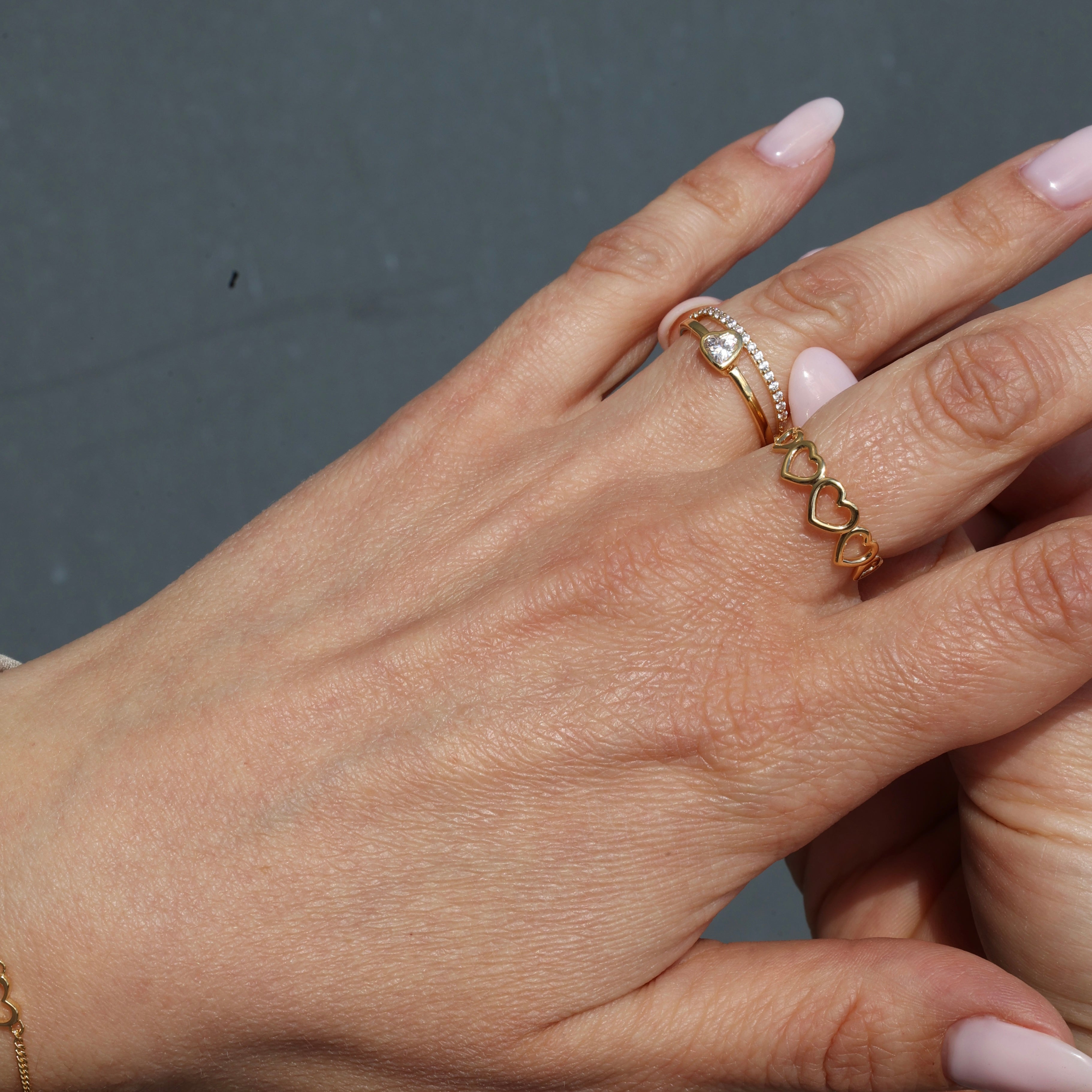 Sparkling Love er en 18 kt. forgyldt dobbelt-ring, der smelter cool og cute sammen i ét look. Den ene ring glitrer med 20 små CZ-sten, den anden bærer en enkelt CZ – formet som et lille hjerte, der sidder let på skrå. Fordi kærlighed sjældent er perfekt… og det er netop det, der gør den smuk.