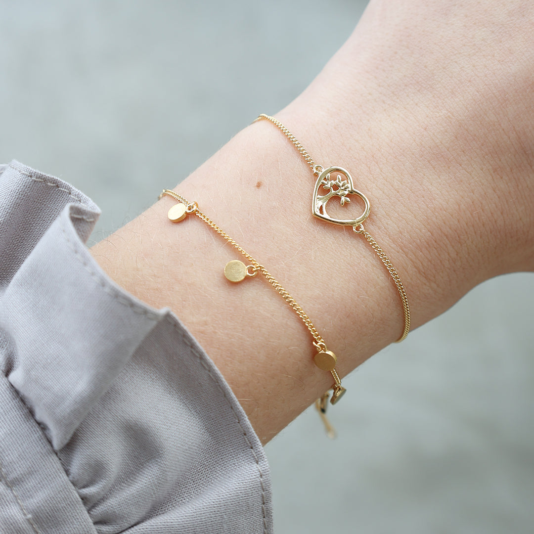 Smukkeste armbånd med 7 små plader i mat look i hver deres lille øsken rundt i kæden. Armbånden er i 18 karat forgyldt sterlingsølv.
