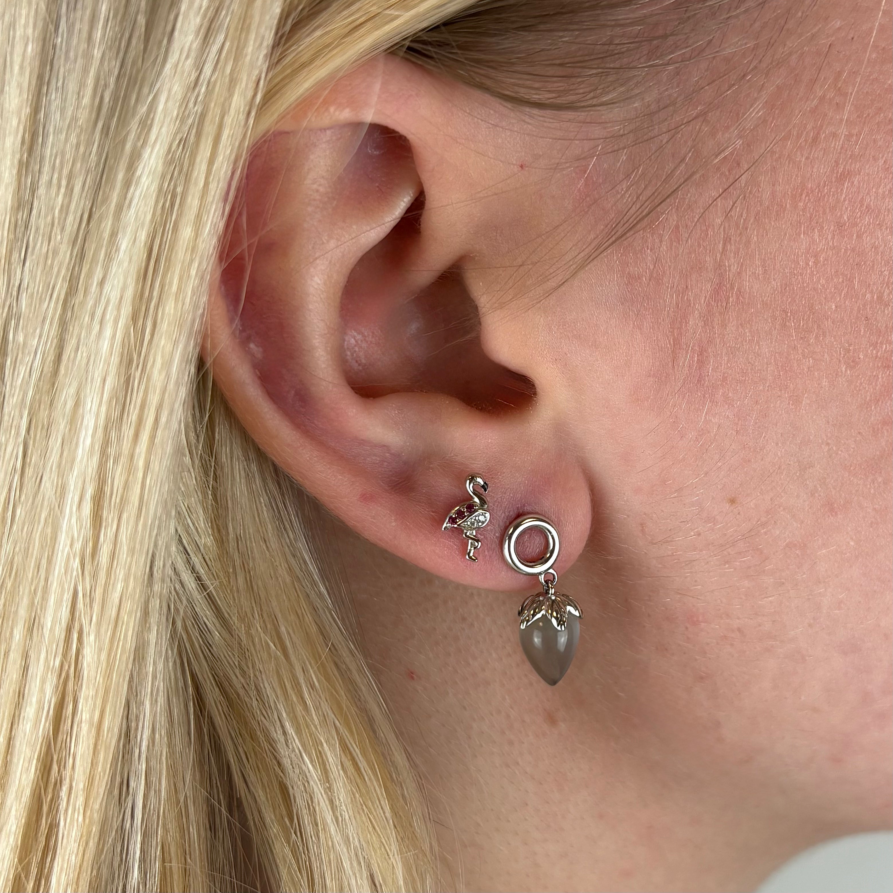 En ørestik formet som en sød lille flamingo og er prydet med lysserøde og hvide cubic zirconia sten. Denne farvekombination skaber en livlig og festlig atmosfære og symboliserer elegance og glæde. Med denne flamingo kan du tilføje en legende og tropisk stemning til dit look. De er perfekte til at fremhæve din unikke stil og give et subtilt touch af eksotisk charme.
