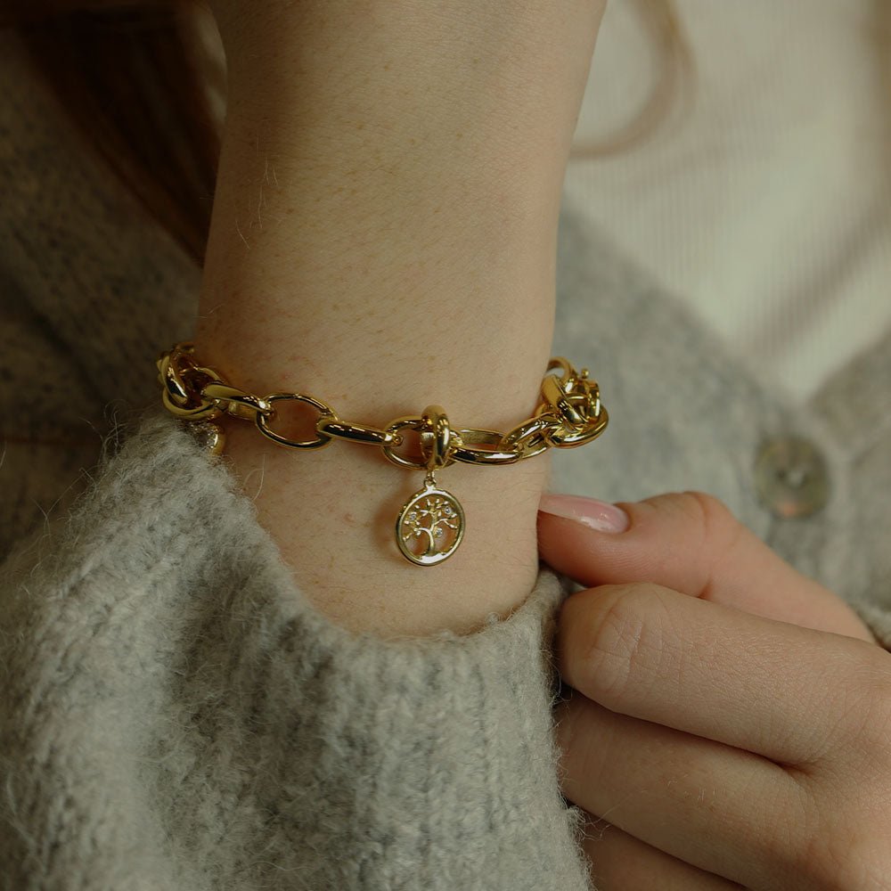 Smuk charm med Livets Træ i forgyldt. Topaz Tree Of Life har en flot blank overflade og 3 ægte topaser. Livets Træ er altid perfekt som gave, til en du holder af, eller måske bare dig selv. Topaz Tree Of Life passer til Classic og 3-string læderarmbånd.