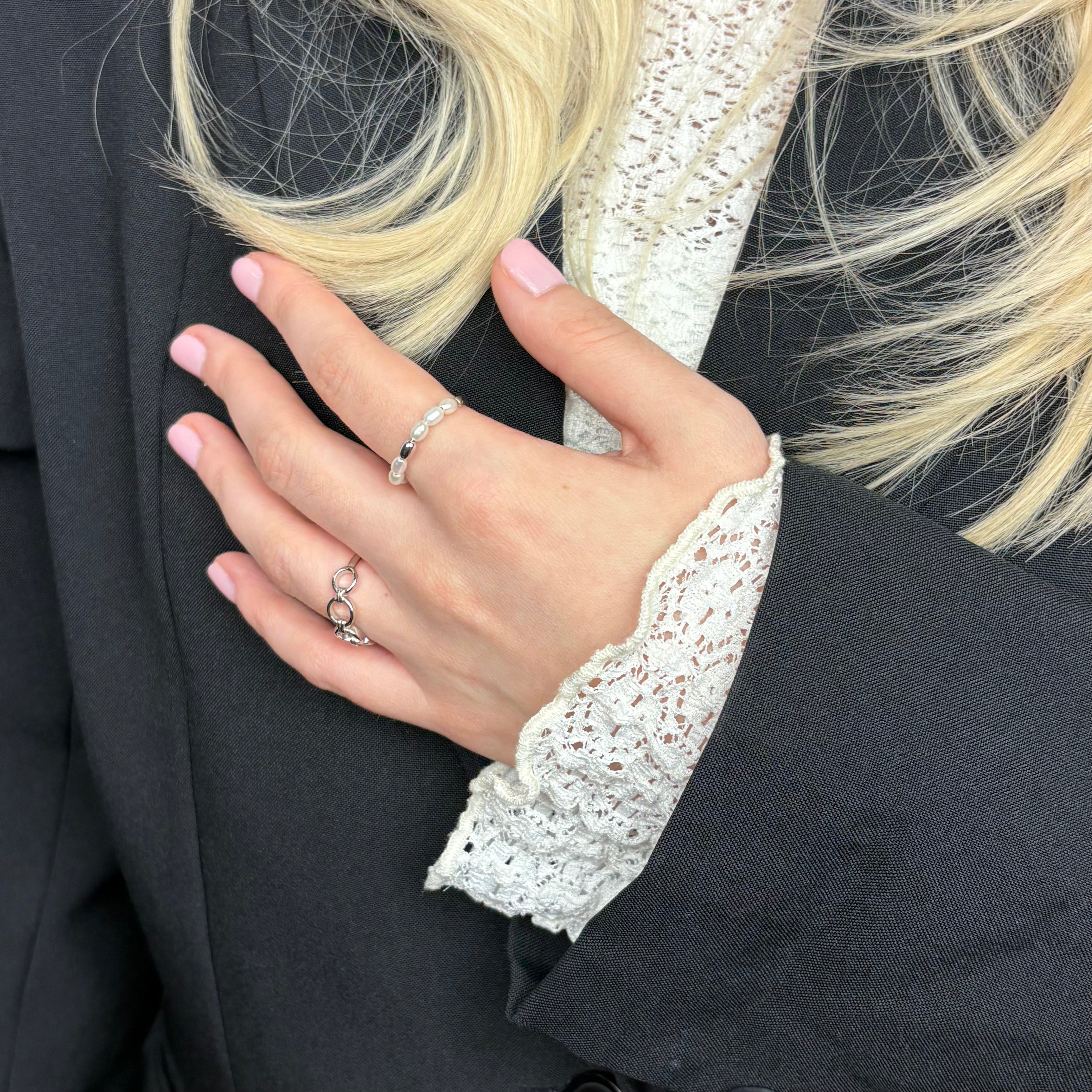 Ringen er et fantastisk valg til både formelle og afslappede lejligheder og vil helt sikkert tilføje et strejf af raffinement til dit look. Uanset om du bærer den alene eller kombinerer den med andre ringe, vil denne ring med perler være et iøjnefaldende smykke, der skiller sig ud.