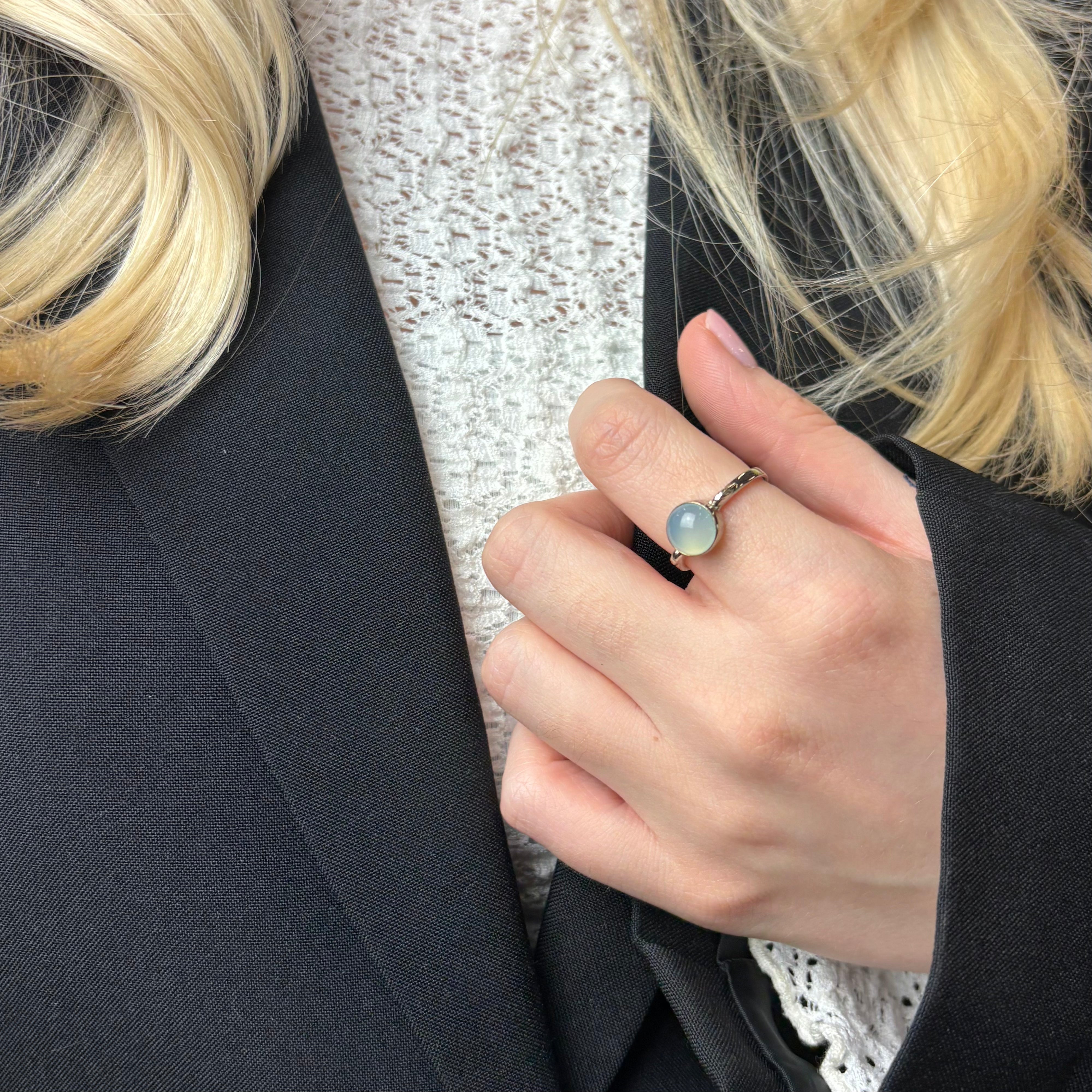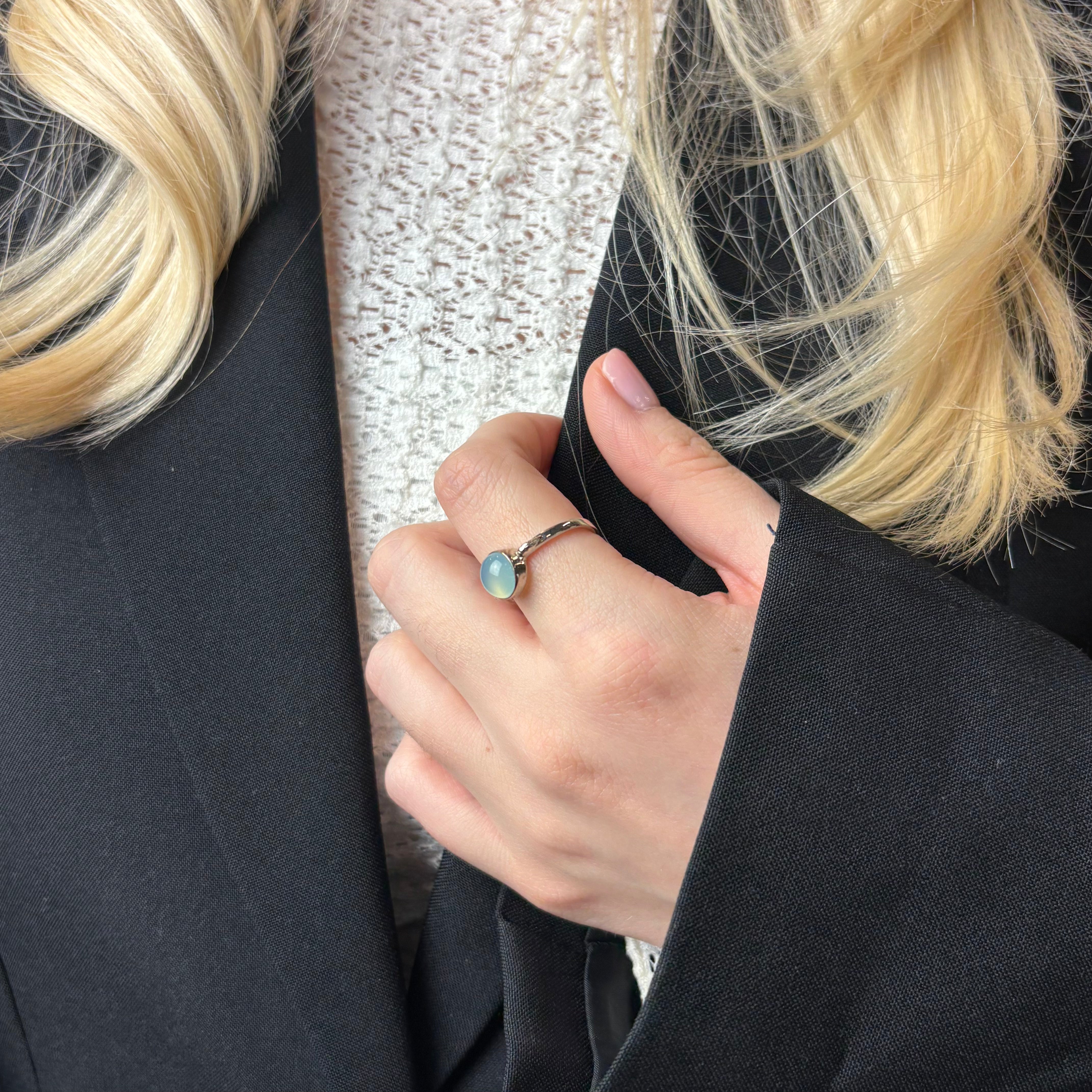 CHRISTINAS Blue Chalcedony ring skaber en dejlig sindsro, som hjælper med at berolige oprørte nerver. Den smukke blå Chalcedony har en yndefuld og harmonisk energi over sig. Det er en rigtig drømmering, der leder tankerne langt væk fra den travle hverdag.
