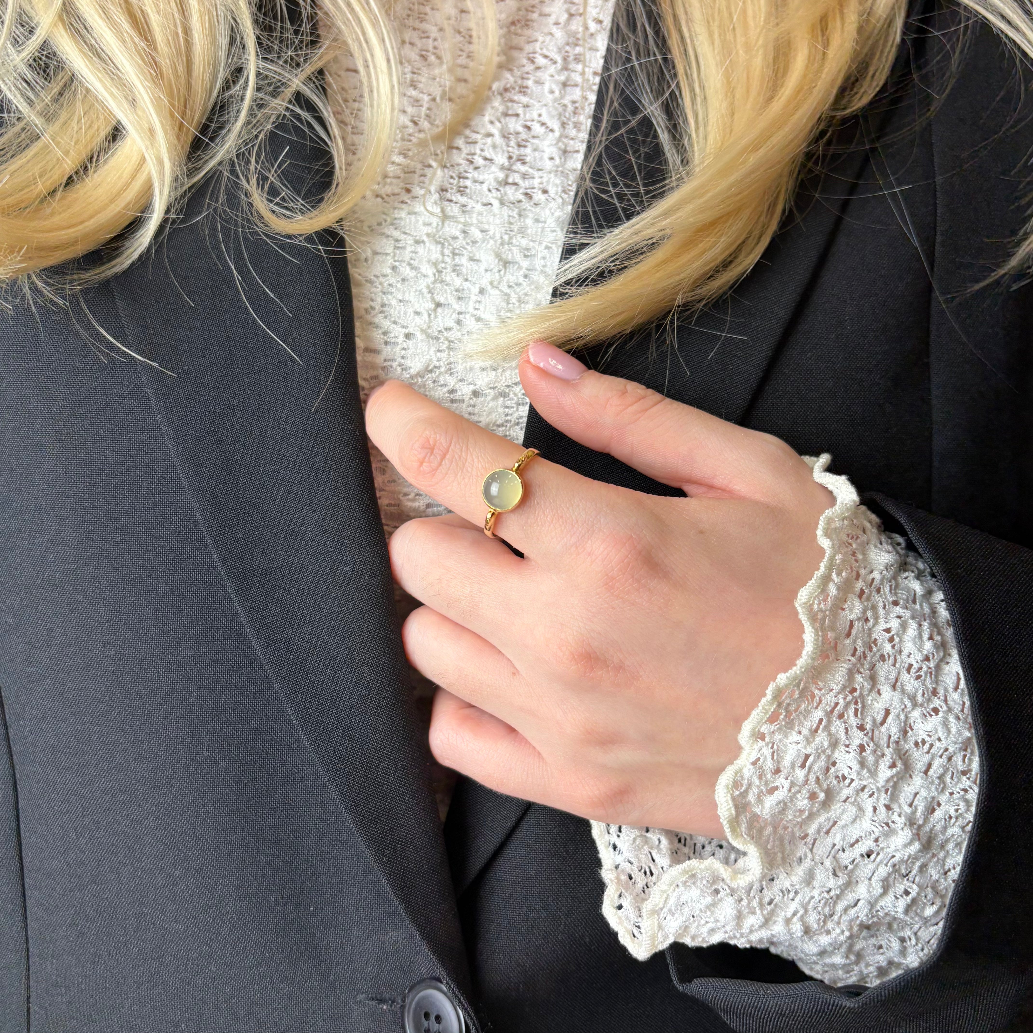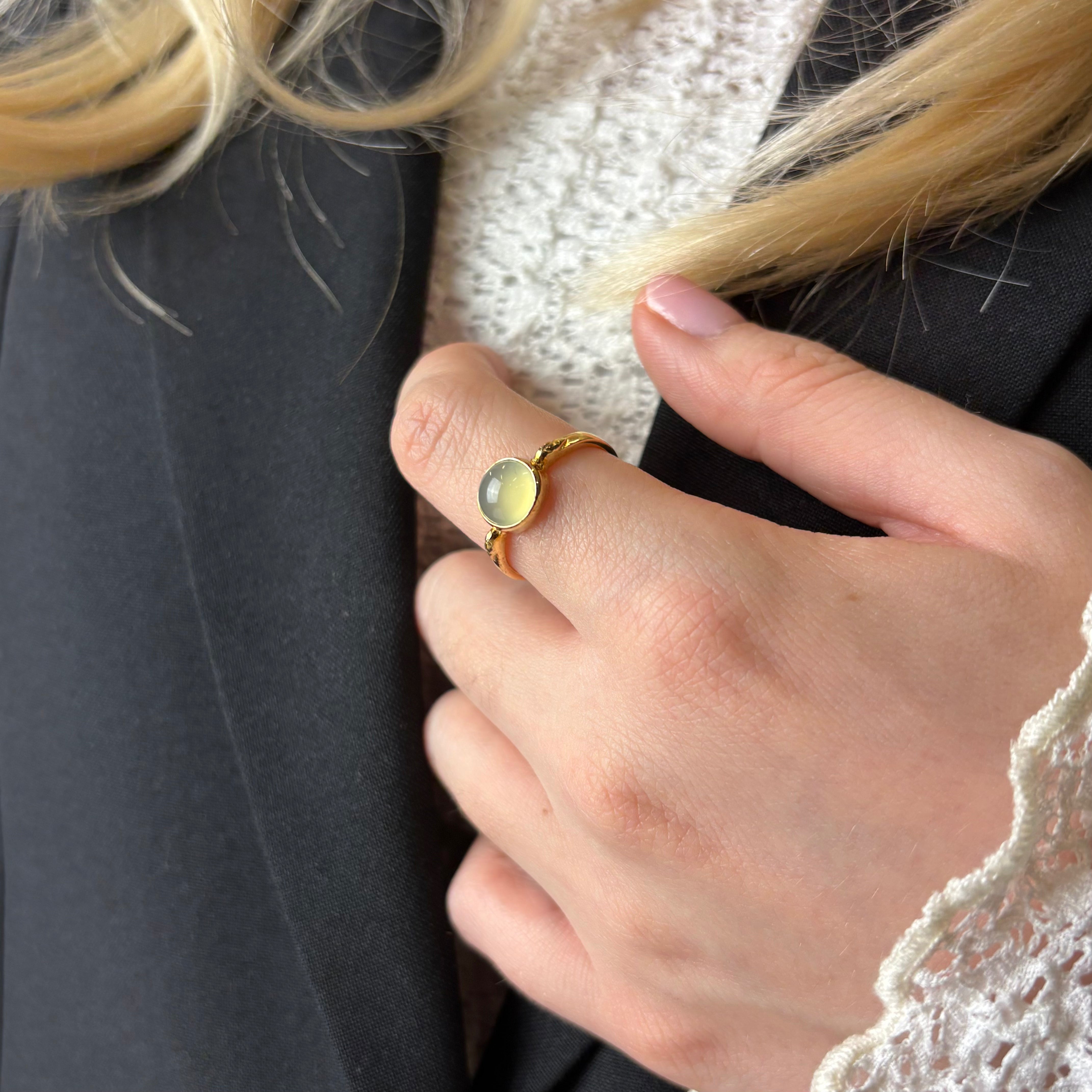 CHRISTINAS Blue Chalcedony ring skaber en dejlig sindsro, som hjælper med at berolige oprørte nerver. Den smukke blå Chalcedony har en yndefuld og harmonisk energi over sig. Det er en rigtig drømmering, der leder tankerne langt væk fra den travle hverdag.