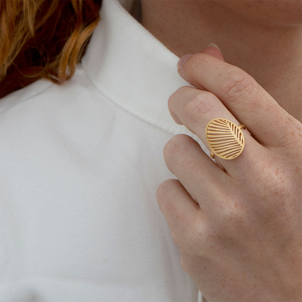 CHRISTINAS Palm ring i forgyldt sterlingsølv tager inspiration i sydens sol, hvor ringens mønster er inspireret af palmeblade. En flot ring som passer til alle fingre med sin flotte matte overflade.