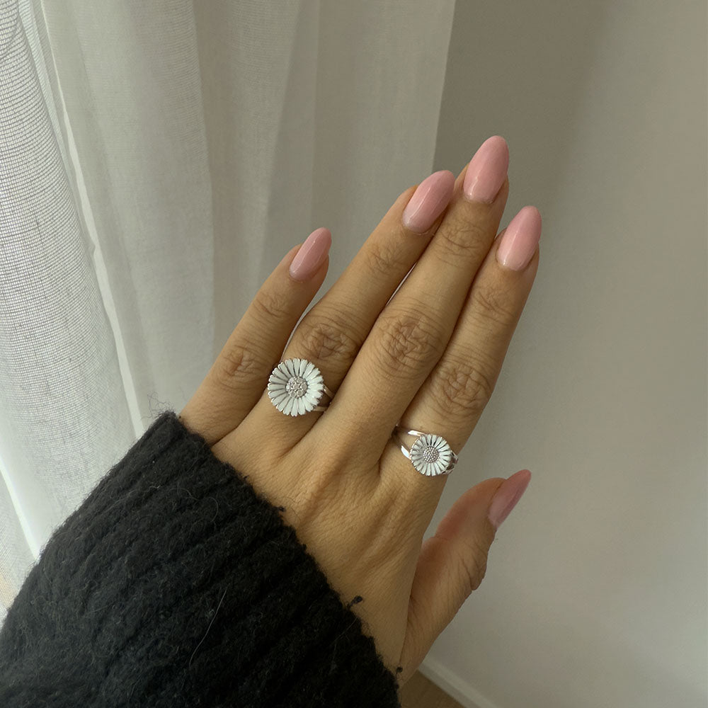 Denne elegante marguerite ring er smukt udført med håndmalet hvid emalje, der fremhæver marguerittens delikate skønhed. Med en diameter på 11 mm er ringen både diskret og iøjnefaldende på samme tid. Margueritten symboliserer uskyld, renhed og skønhed og tilføjer et subtilt og naturligt element til din stil. Marguerite ringen er en perfekt måde at udtrykke din kærlighed til blomster og natur på. Bær den som et smukt tilbehør og lad den minde dig om skønheden i en enkelt blomst hver gang du kigger på den.