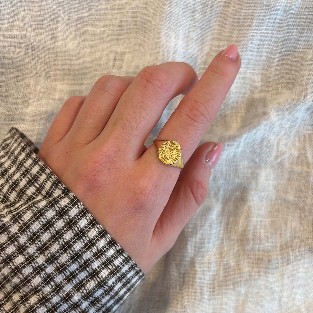 Denne 18 kt. forgyldte ring har et organiske mønster inspireret af fingeraftryk. Unikt, råt og personligt. Hver linje i designet snor sig som et symbol på identitet, spor og historie.