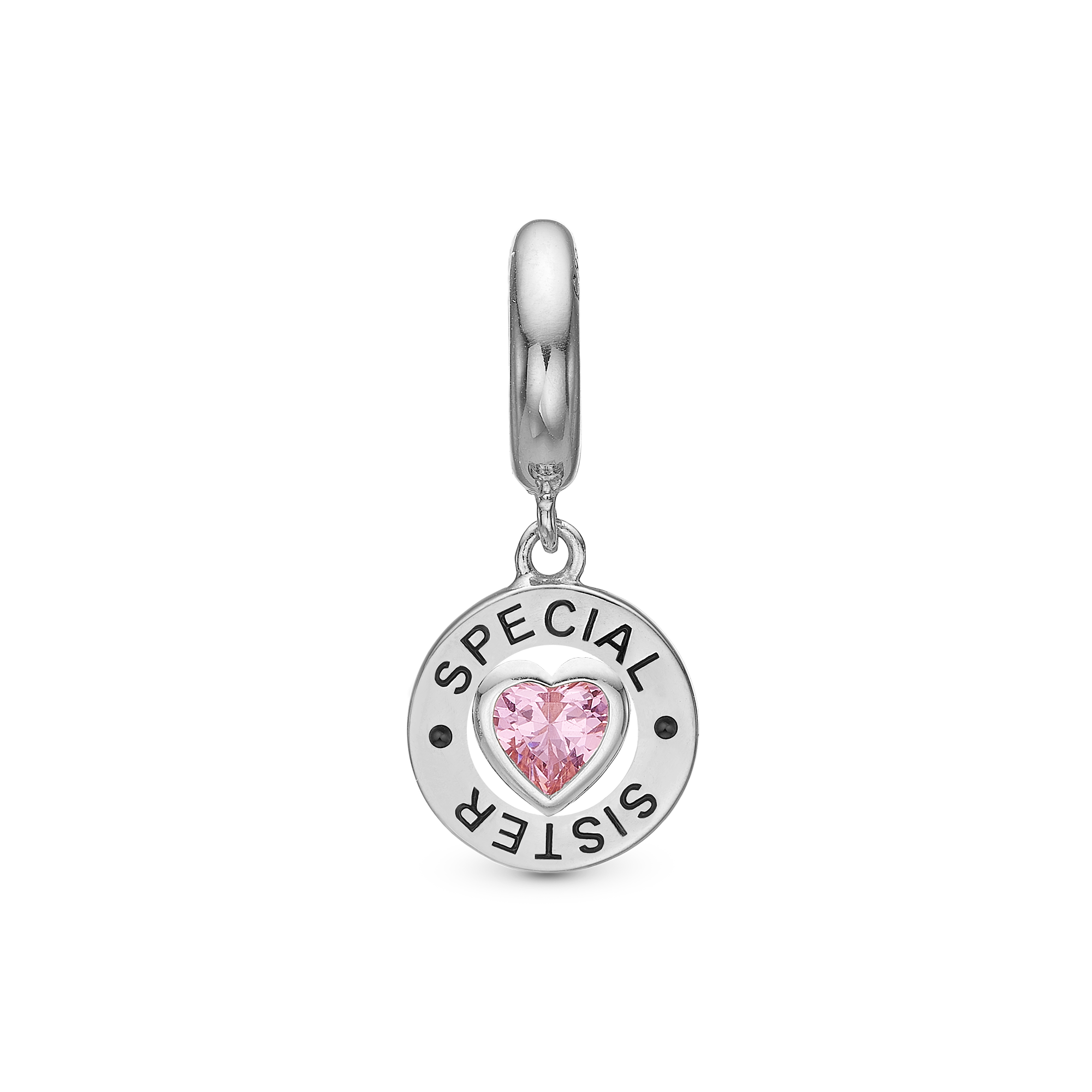 Special Sister charm som er udarbejdet i 925 sterling sølv, har en flot hjertesleben Pink Turmalin, og en ingravering med ordene Special Sister på forsiden og Together Forever på bagsiden. Special Sister er den perfekte gave til din eller en søster du kender, da den symbolisere evig søsterkærlighed. Det kunne også være en gaveidé til en tæt veninde du holder af. Special Sister charm passer til Classic og 3-string læderarmbånd, men også som vedhæng til dine halskæder.