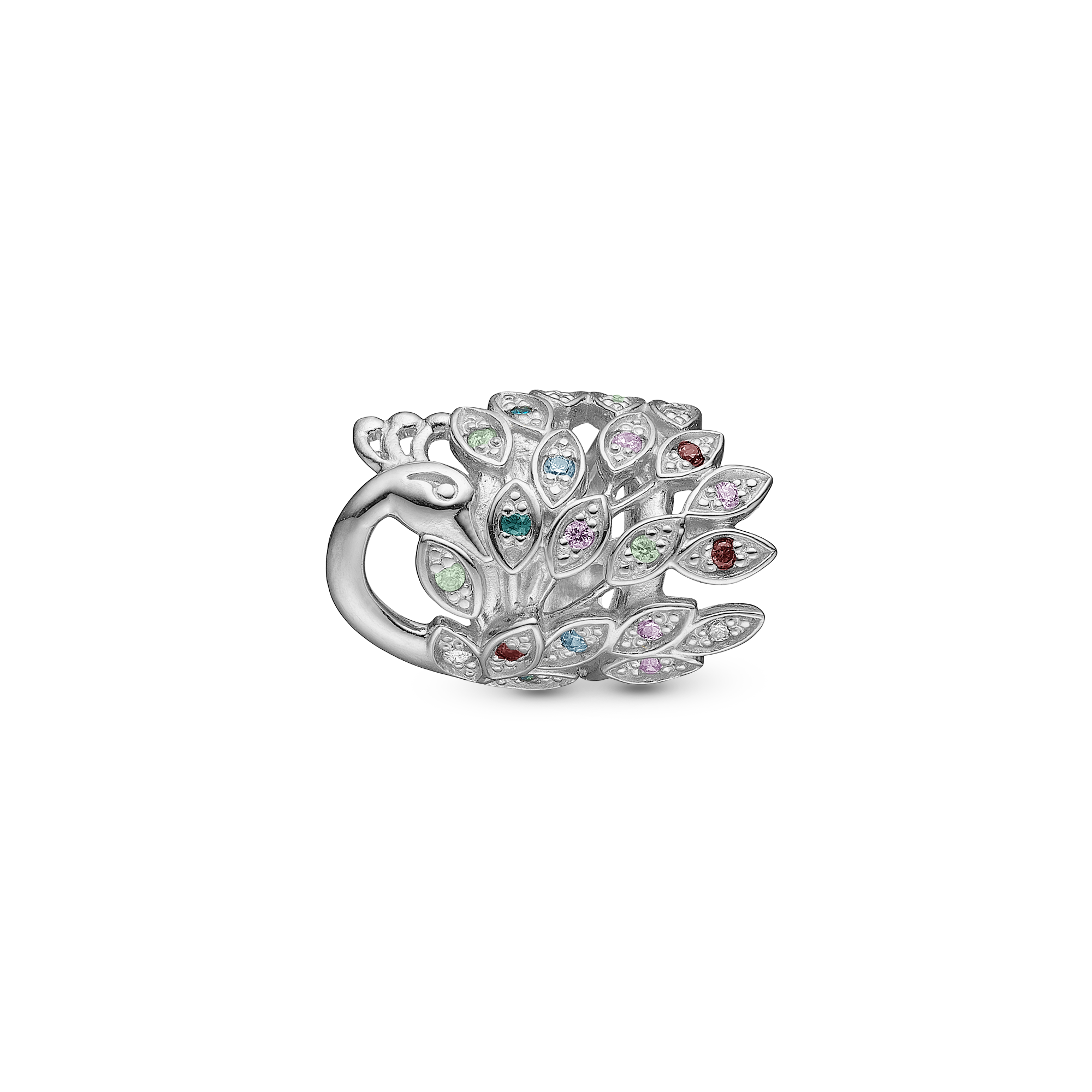 Peacock charm i 925 sterling sølv med 21 farverige CZ. Leder du efter en charm, der har et Colourful Living look, men samtidig også en charm, med symbol for evigt liv, så er vores påfugle charm, lige noget for dig. Påfugl charmen er til dig, som leder efter smykker med farverige sten. Peacock designet fås også i vedhæng, ørestikker og ring. Peacock charm passer kun til Classic og 3-string læderarmbånd.
