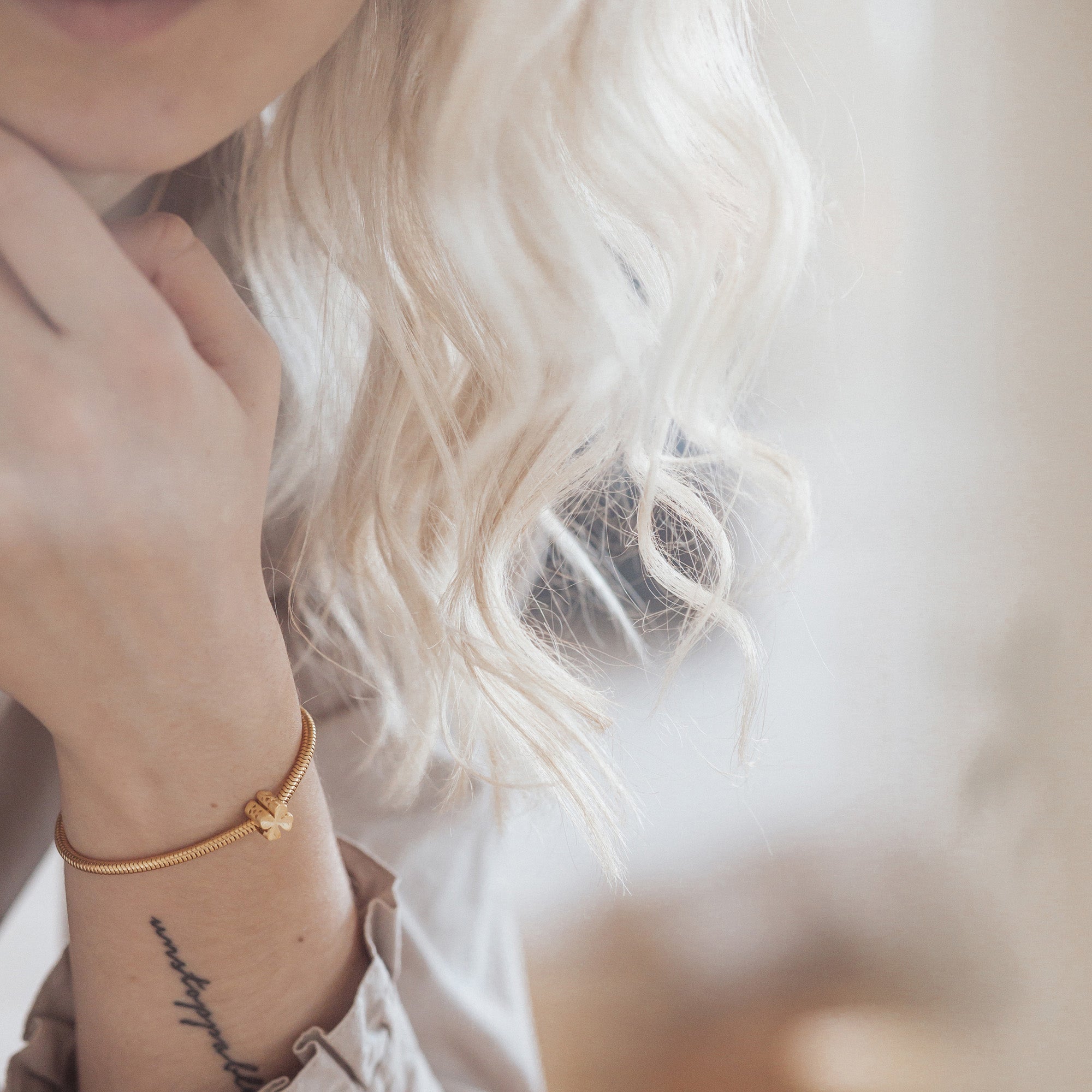 Held i livet og i kærligheden. Så hvis du leder efter et smykke med et lykkebringende budskab er Four Leaf Clover det perfekte valg. 4 mm Charmen passer til Slim læderarmbånd, Forgyldte Sølv armbånd og Link armbånd