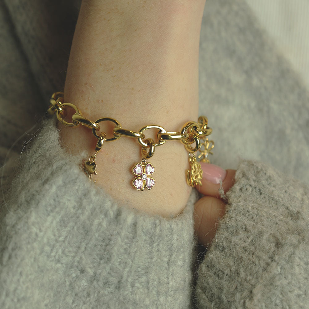 Pink Heart Clover - Hænger Charm 4 mm Til Armbånd - Blankpoleret Forgyldt Sterling Sølv m. 5 Cubic Zirkonia