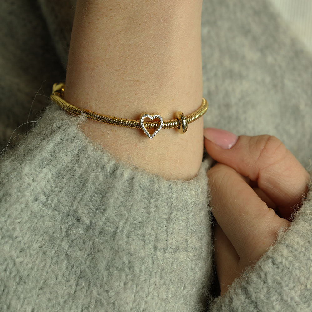 Shiny Stopper charm i forgyldt har et klassisk og blankt design der passer til alt. CHRISTINAS stopper-charms har en silikonering, der sørger for at charmen sidder fast på dit armbånd og forhindrer de andre charms på dit Sølvarmbånd i at glide rundt. Bemærk at denne charm KUN passer til CHRISTINA Sølvarmbånd.
