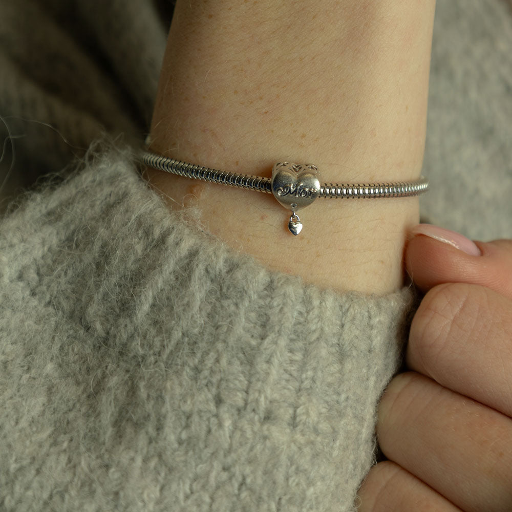 Smuk mor-charm i sterling sølv med et fint hængende hjerte og en ægte topas. Perfekt til mødre eller med tanke på en speciel mor der arbejder hårdt og nu fortjener en smuk personlig gave. Alle mødre har fortjent lidt forkælelse. Denne charm passer til CHRISTINAS Slim læderarmbånd og Sølvarmbånd.