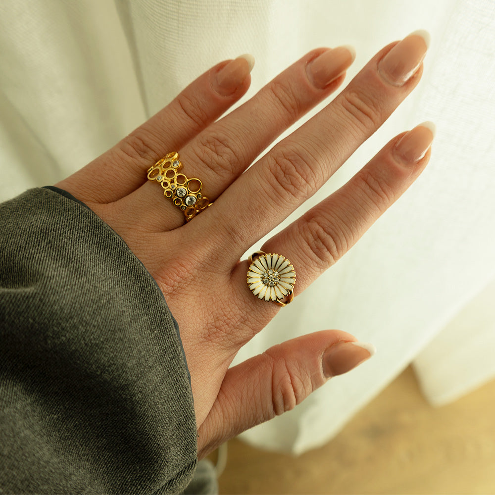 Cocktail ringen fra CHRISTINA er små ovale ringe i forskellige størrelser, som er sat sammen til én stor ring. Ringen er er med otte ægte topaser og findes i både sølv og forgyldt.
