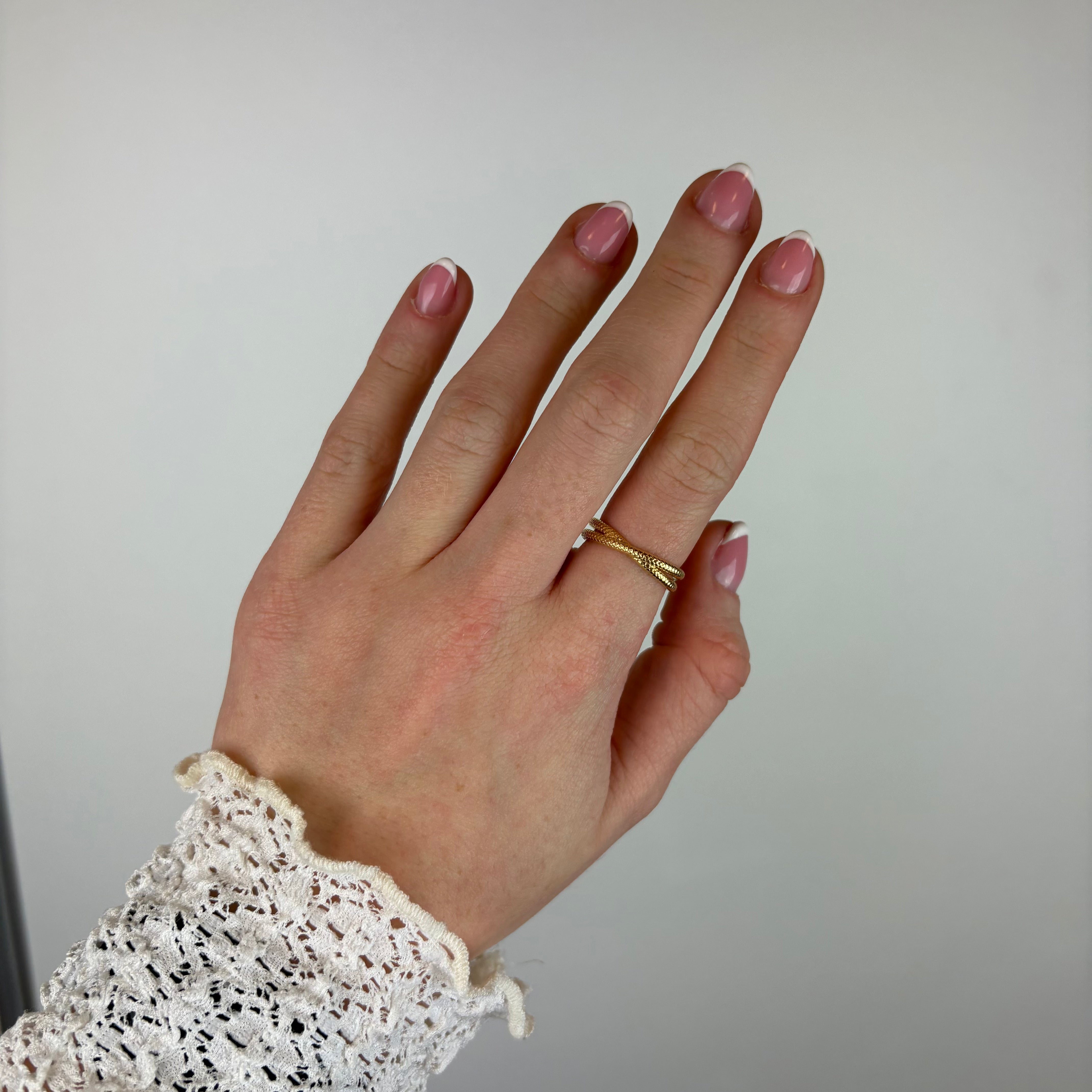 Vores tidløse forgyldte Snake ring har et slangelignende skindlook, som snor sig over fingeren af to omgange. Det giver et råt, men samtidig et meget fint og feminint udtryk.