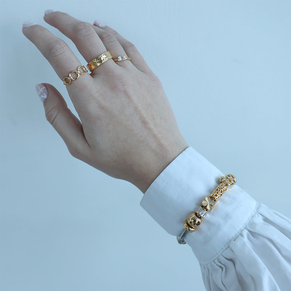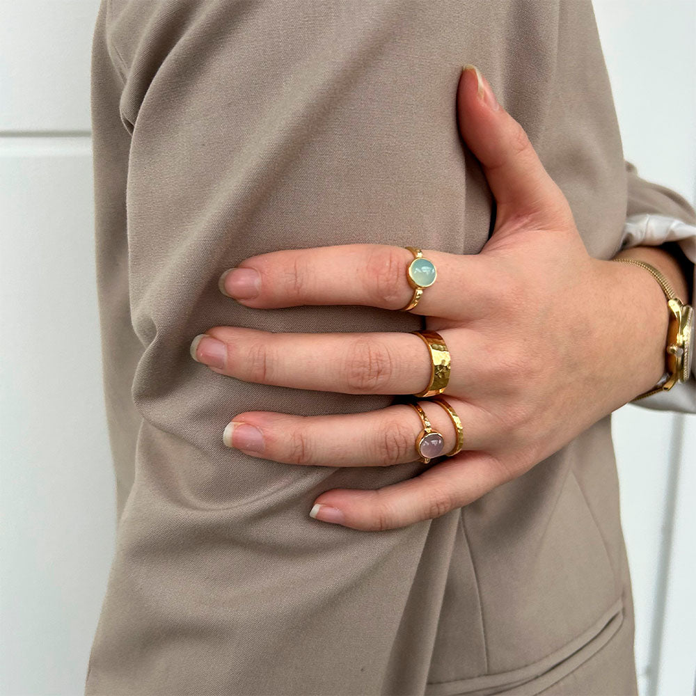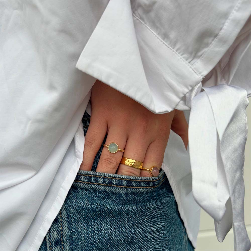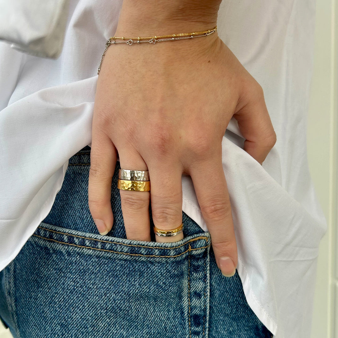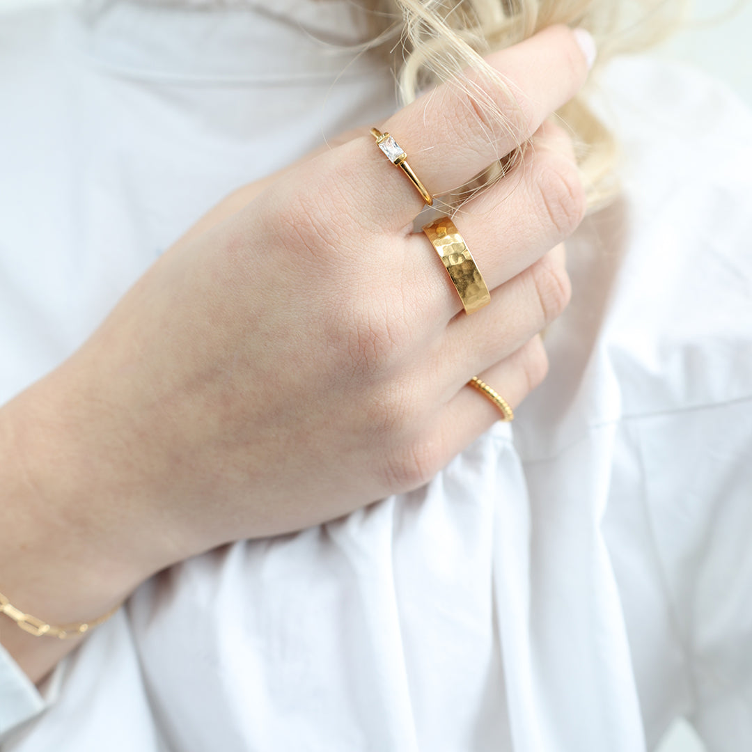 Moderne og tidløs ring i råt design, med banket overflade over hele skinnen. Ringen er i 18 karat forgyldt sterlingsølv og er perfekt til både hverdag og fest - og er også utolig populær som tommefingerring.