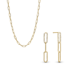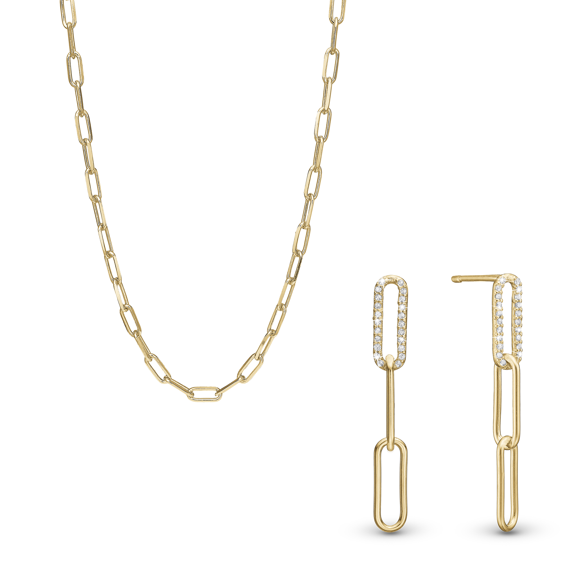 Halskæden imponerer med sine markante kædeled, der udstråler tidløs stil og selvsikker elegance. Øreringene fuldender sættet med deres unikke kombination af kædeled og funklende sten, der fanger lyset fra alle vinkler.