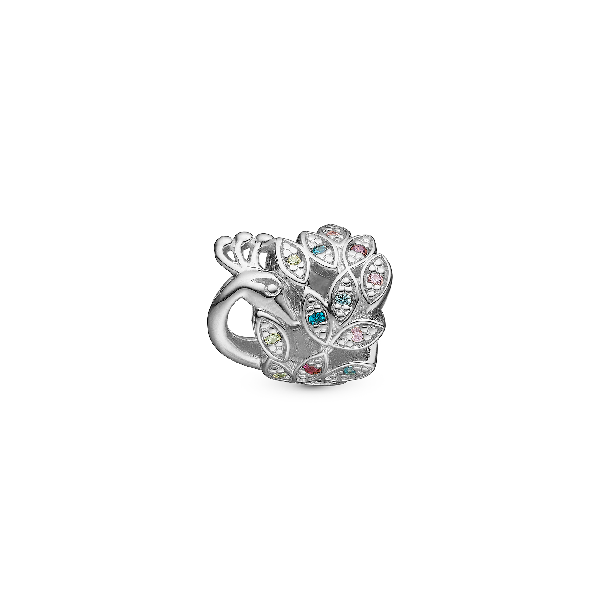 Peacock charm er en smuk påfugl charm, der er pyntet med 13 farverige CZ. Peacock charm er til dig, som leder efter et farverigt look, til dit Sølvarmbånd, Slim læderarmbånd og lædersæt. Peacock charm er udarbejdet i 18 karat forgyldt sterling sølv og passer til CHRISTINAS Slim læderarmbånd og Sølvarmbånd.