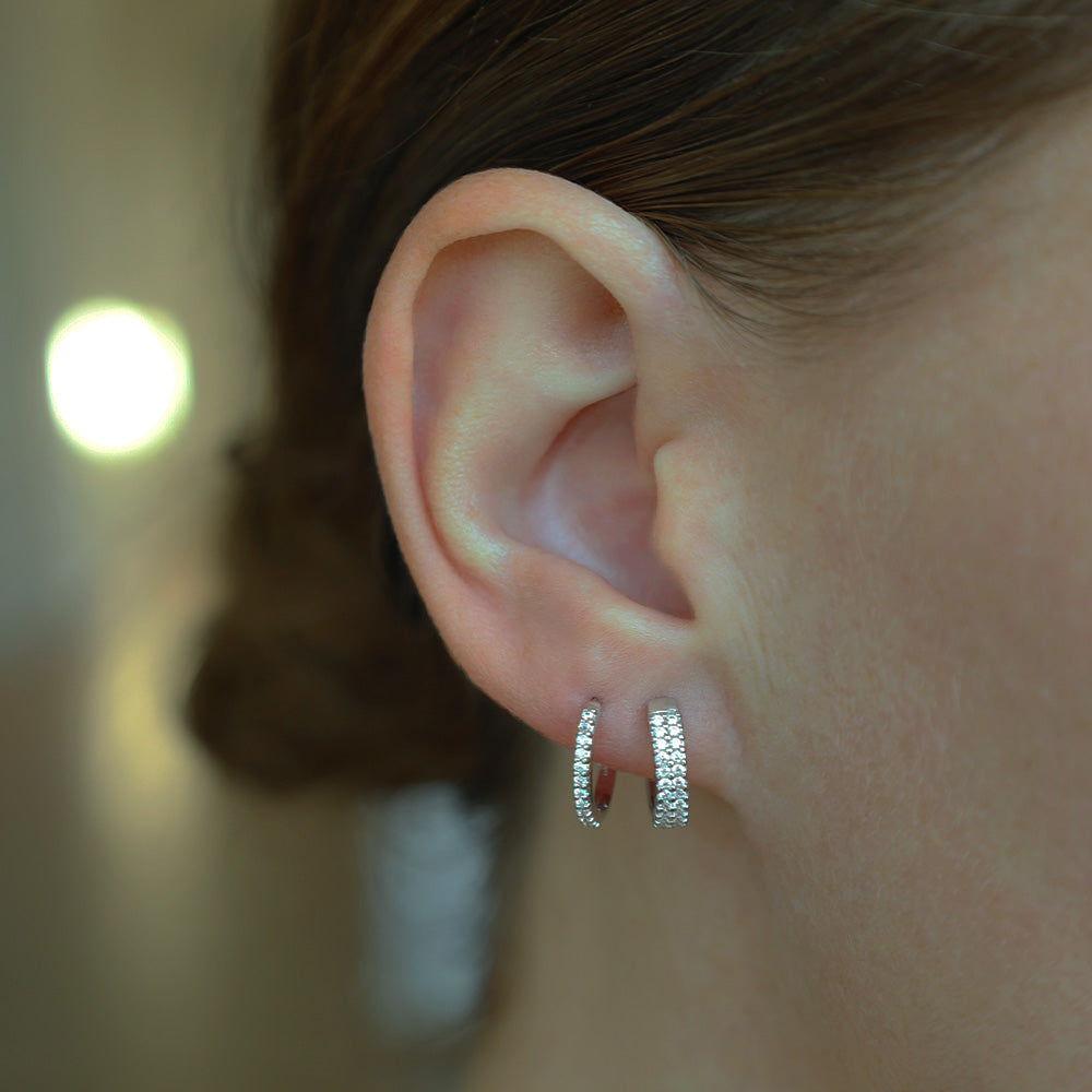 Fine 13mm Croeler fra CHRISTINA Collection 2023, udarbejdet i 925 sterling sølv, med 44 Cubic Zirkonia. Creolerne Charmed, har en masse funklende sten, der giver ens øre et smukt bling. Perfekt som gave til din mor eller hende du holder af. Du kan med fordel pynte dine Charmed creoler med CHRISTINA charms.