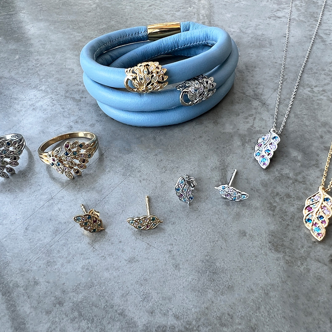 Disse smykker inspireret af påfuglens fortryllende farvespil forener elegance, ynde og en anelse mystik. De fine detaljer og nuancerede sten giver et levende udtryk, der fanger lyset på smuk vis og tilfører dit look et strejf af personlighed.