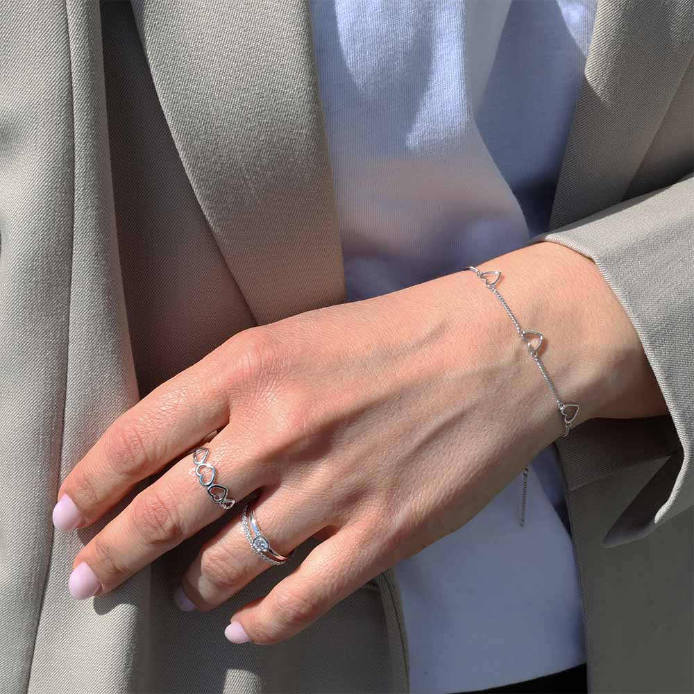 Et armbånd, der leger med kontrasten mellem tilstedeværelse og frihed. De fem åbne hjerter svæver let på fine kæder og symboliserer en kærlighed, der er der – men ikke helt bundet. Et smykke, der emmer af boheme, luksus og personlig stil.