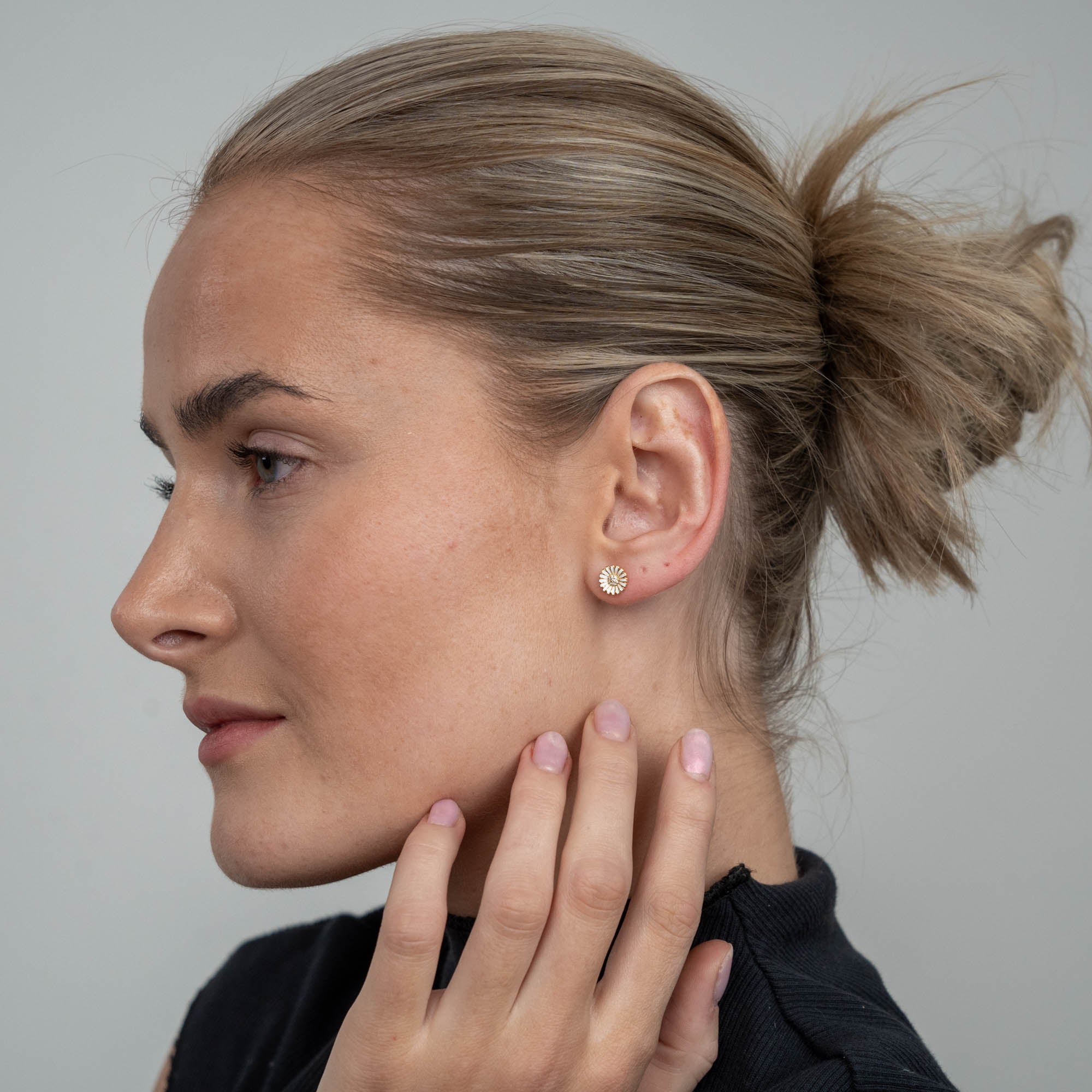 Søde og delikate marguerite ørestikker er et charmerende tilbehør til enhver lejlighed. Med deres små størrelse på 8 mm er de perfekte til dem, der ønsker et diskret og feminint look. Hver marguerit er omhyggeligt håndmalet med hvid emalje, der skaber en livlig og detaljeret blomsterform. For at tilføje en ekstra glans er der indsat små cubic zirconia sten i midten af hver marguerit.