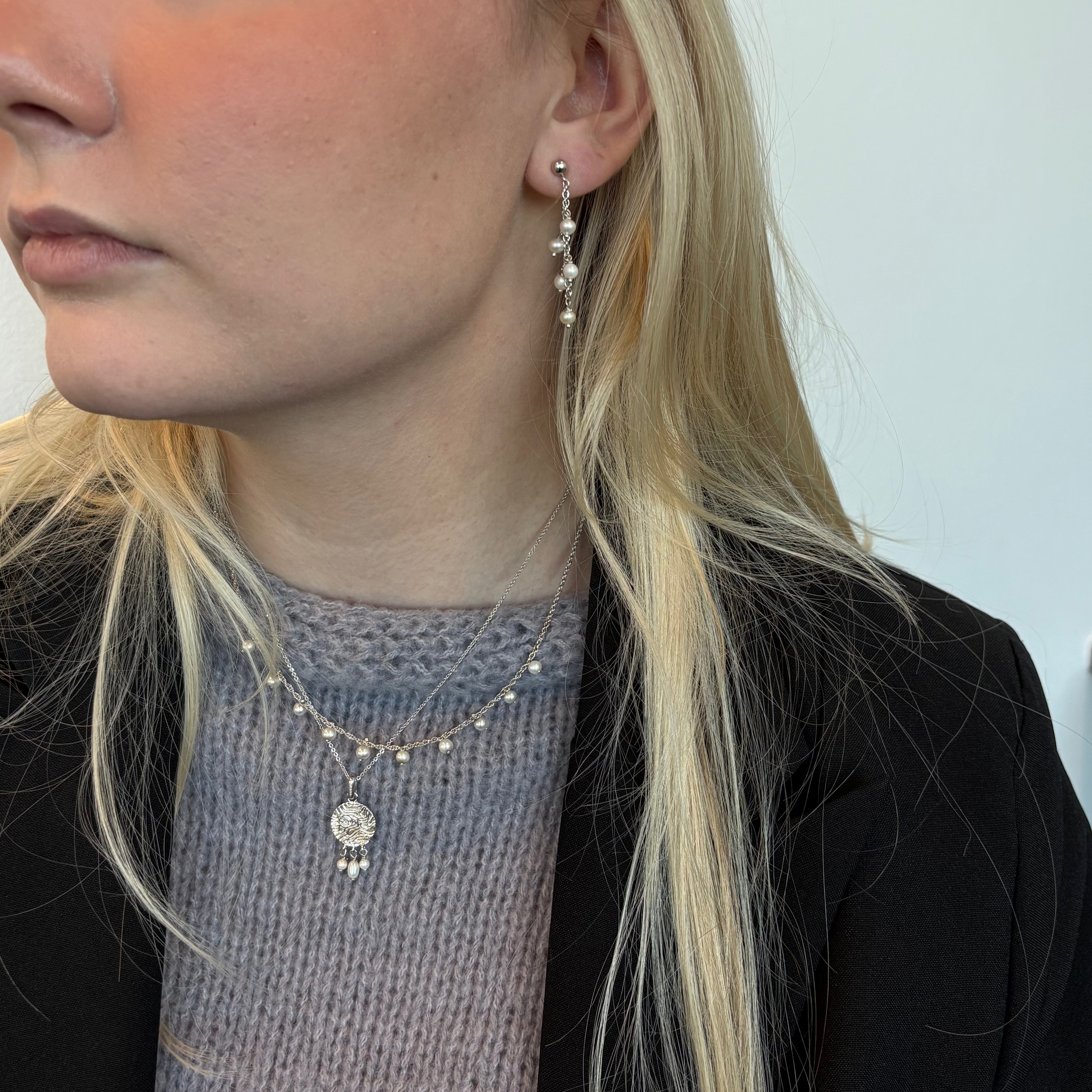 "Dangling Pearls" halskæden består af smukke, små ferskvandsperler, der hænger og skaber en bevægelse, når du bevæger dig. Smykket symboliserer lethed, elegance og ynde. Det minder os om at omfavne livets flygtige natur og finde skønhed i forandring og bevægelse. Hver perle repræsenterer et øjeblik, der flyder ind i det næste og skaber en harmonisk danse af elegance omkring din hals.