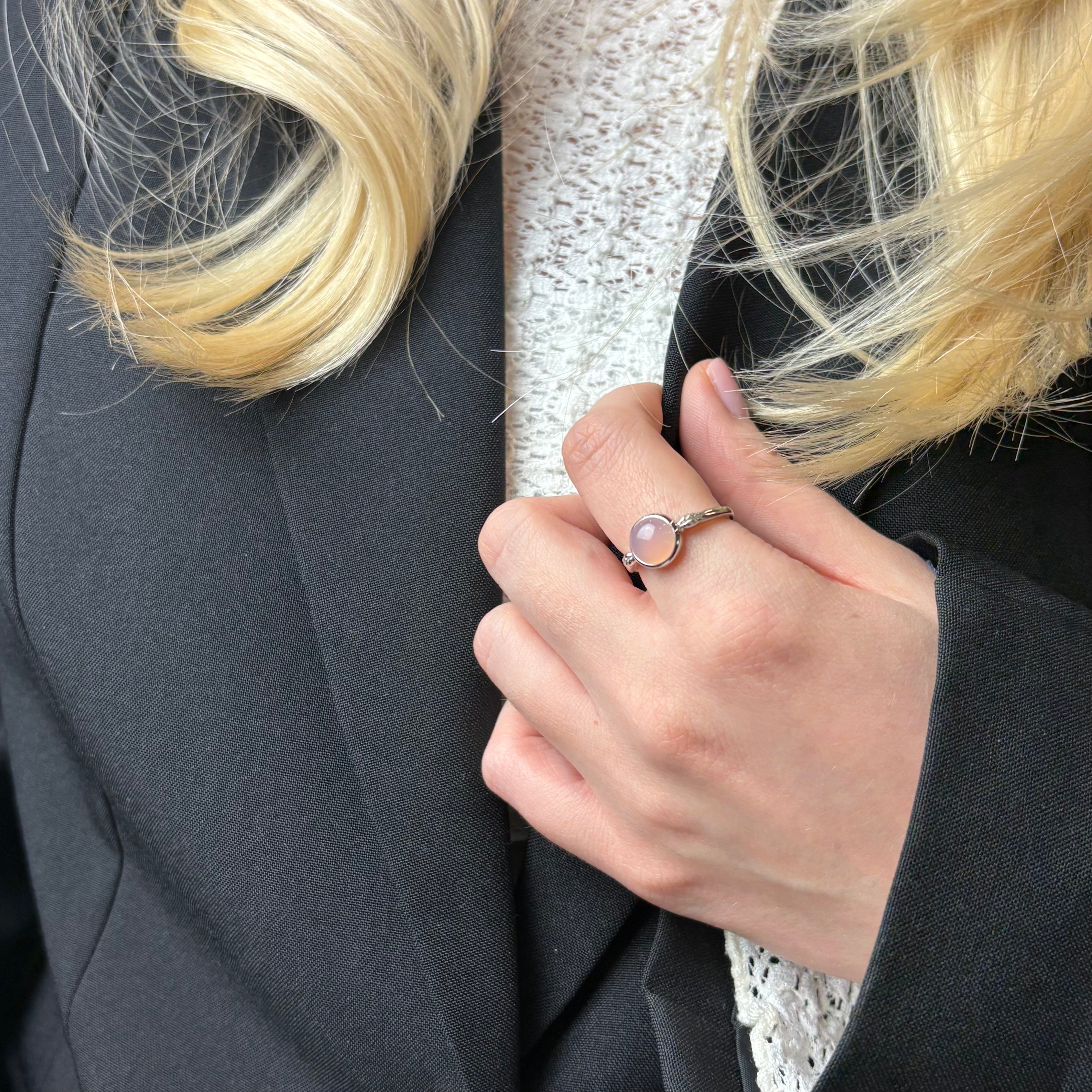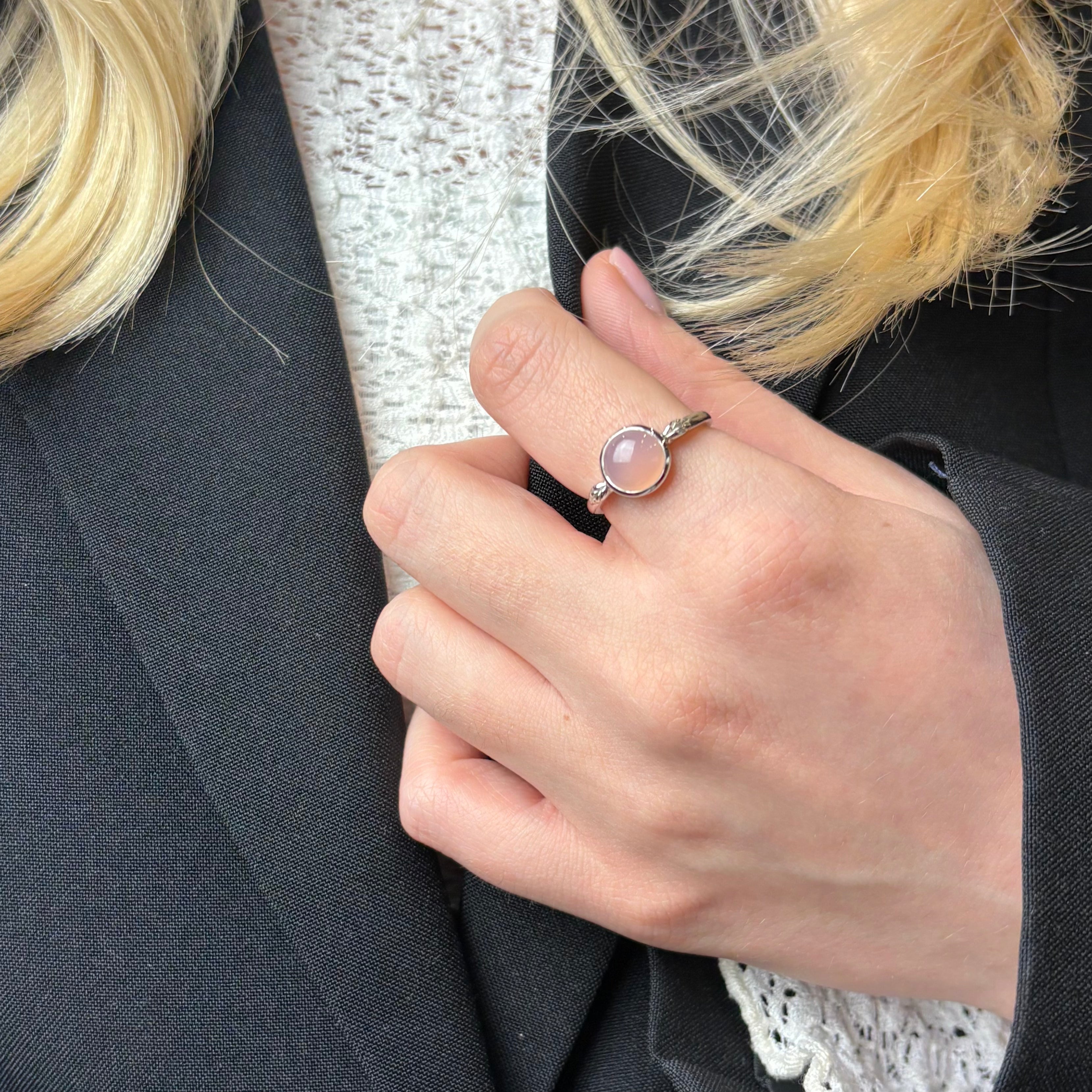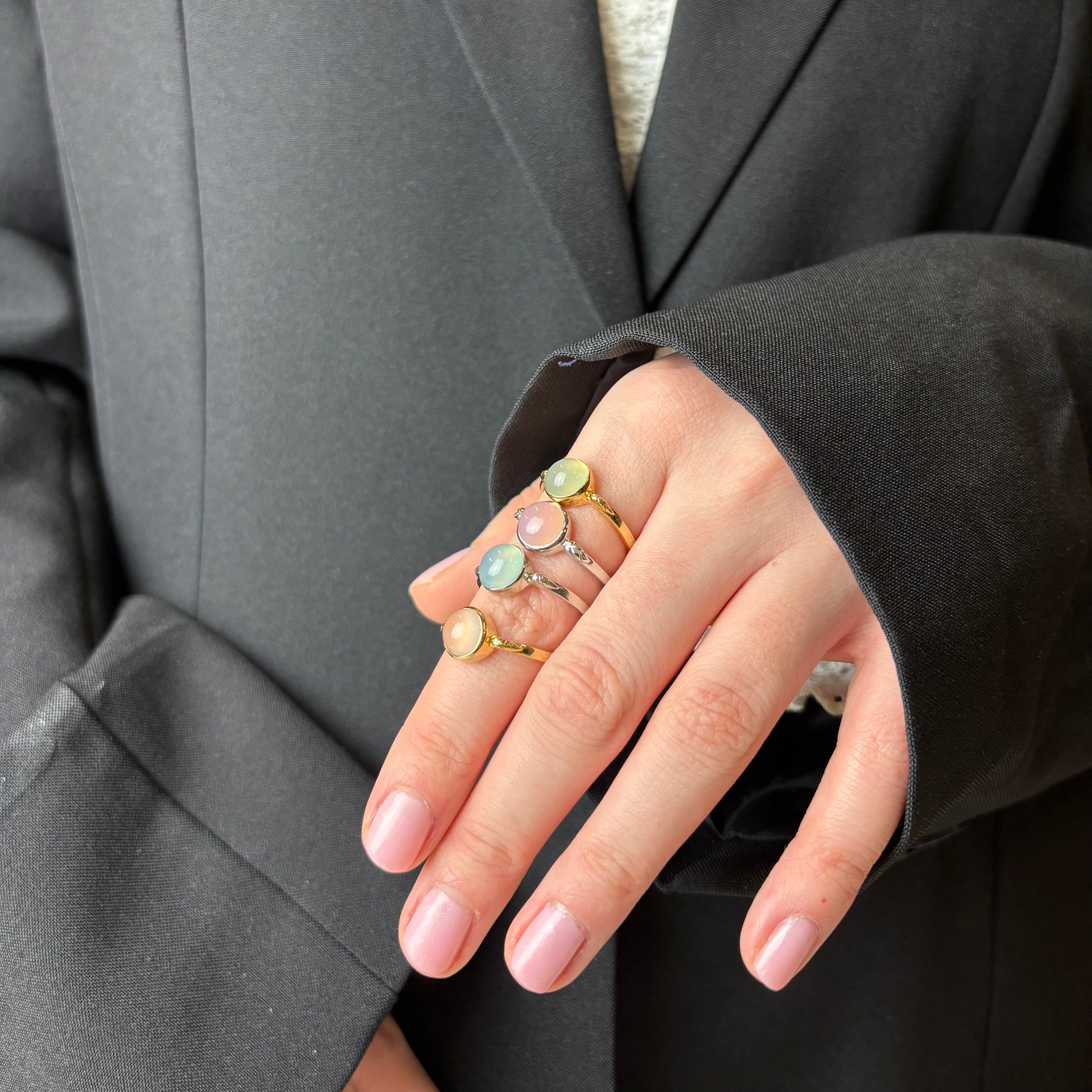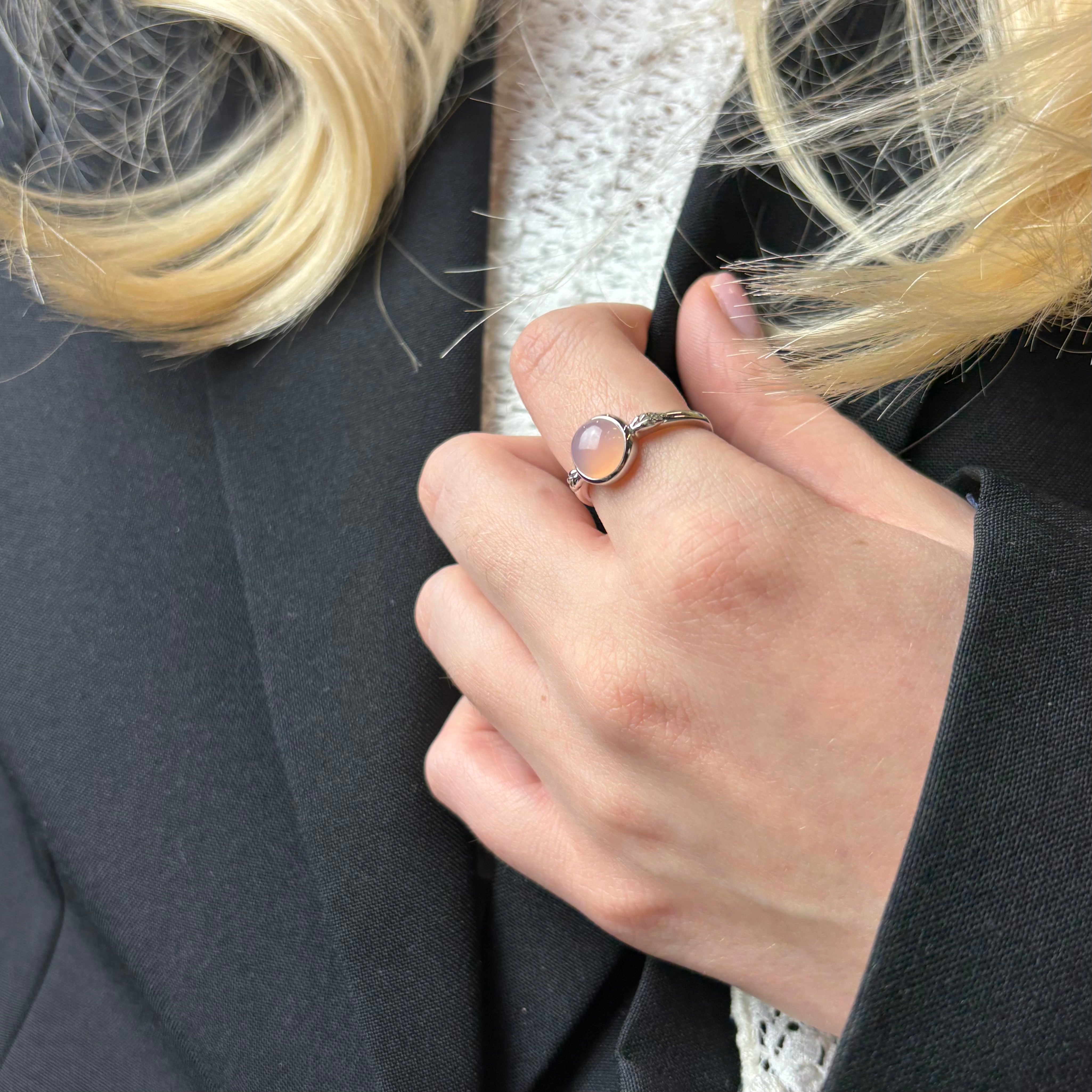 CHRISTINAS Pink Chalcedony-ring signalerer en sindsro, som hjælper med at berolige oprørte nerver. Den smukke Chalcedony-ring har en yndefuld og harmonisk energi over sig. Det er en rigtig drømmering, der leder tankerne langt væk fra den travle hverdag.