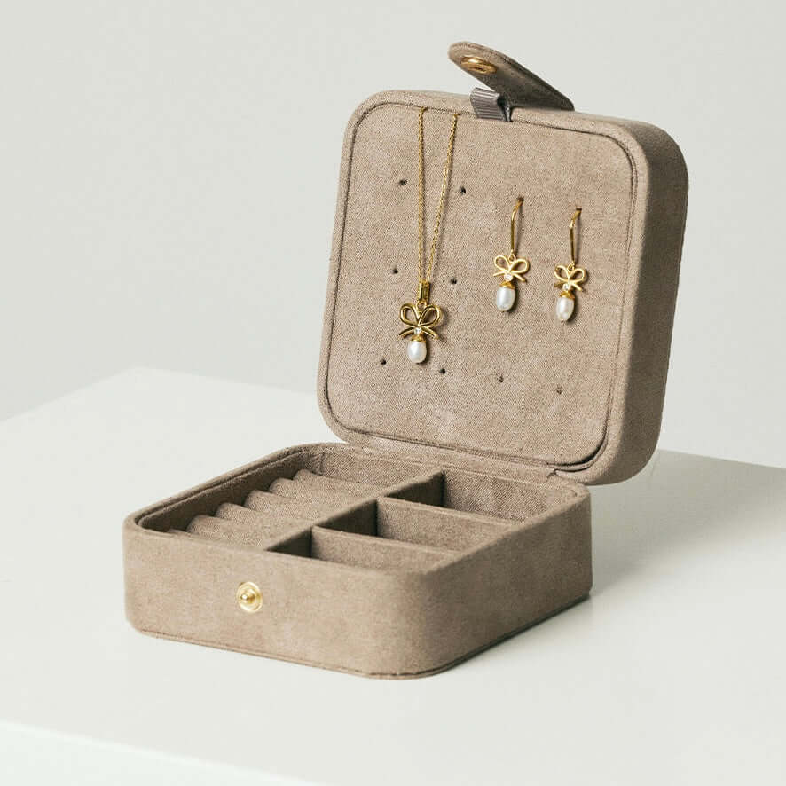 Opbevar dine yndlingssmykker sikkert og stilfuldt med vores CHRISTINA smykkeskrin. Skrinet er betrukket med blødt, gråbrunt stof, der føles som ruskind, og har et elegant udtryk. Med to rum er der plads til både ringe, vedhæng, kæder og øreringe, så du altid kan holde dine smykker organiseret. Det lukkes nemt med en forgyldt knap på fronten, som sikrer, at dine skatte forbliver beskyttede.