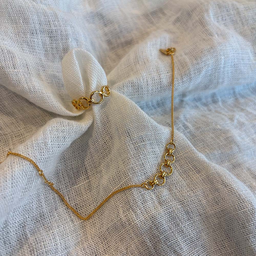 - Armbånd: Fin kæde med tre sammenhængende ringe i midten, justerbar længde for perfekt pasform