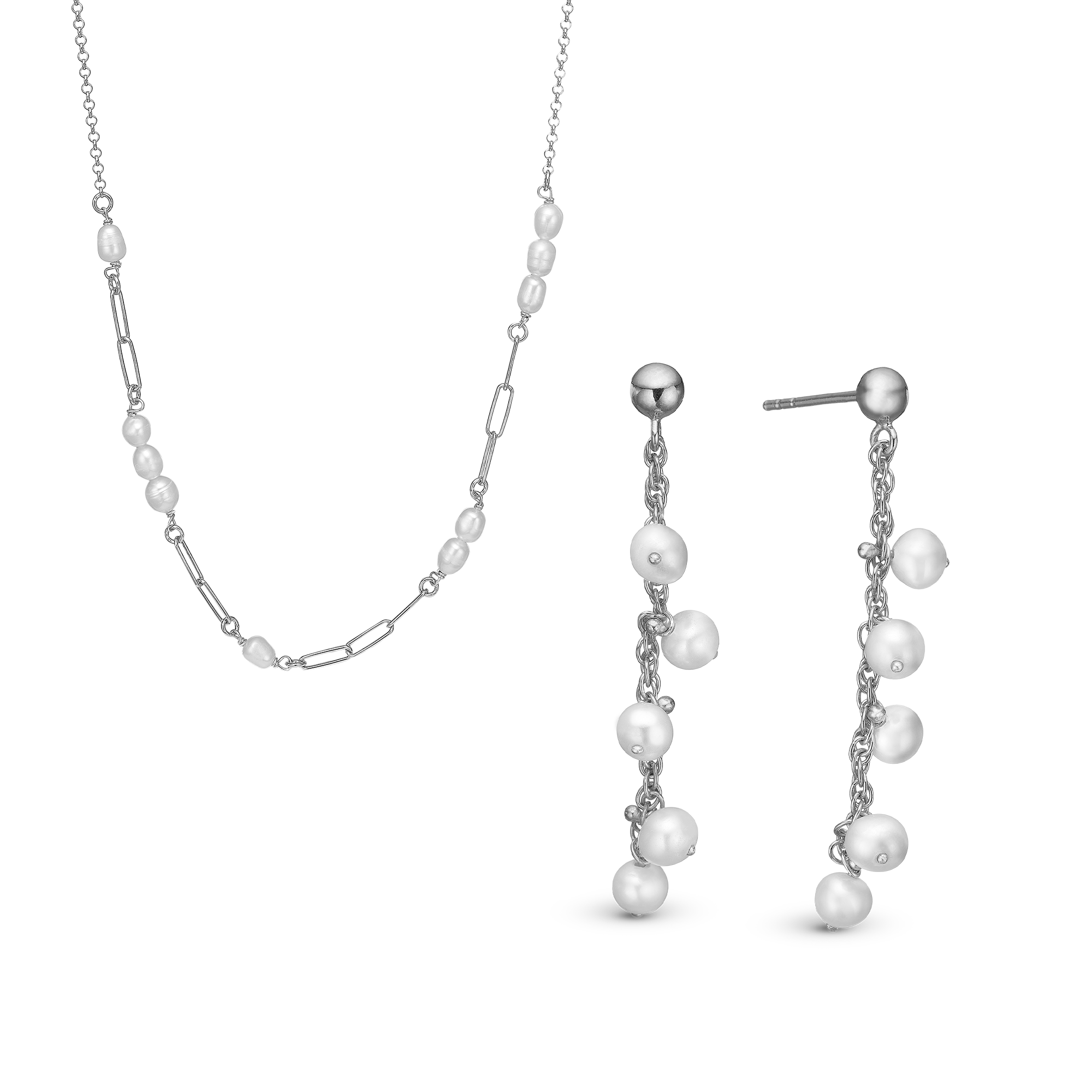 - Halskæden: En delikat kombination af polerede sølvkæder og perler i forskudt mønster. Halskæden fanger lyset smukt og tilføjer et strejf af elegance til ethvert outfit.